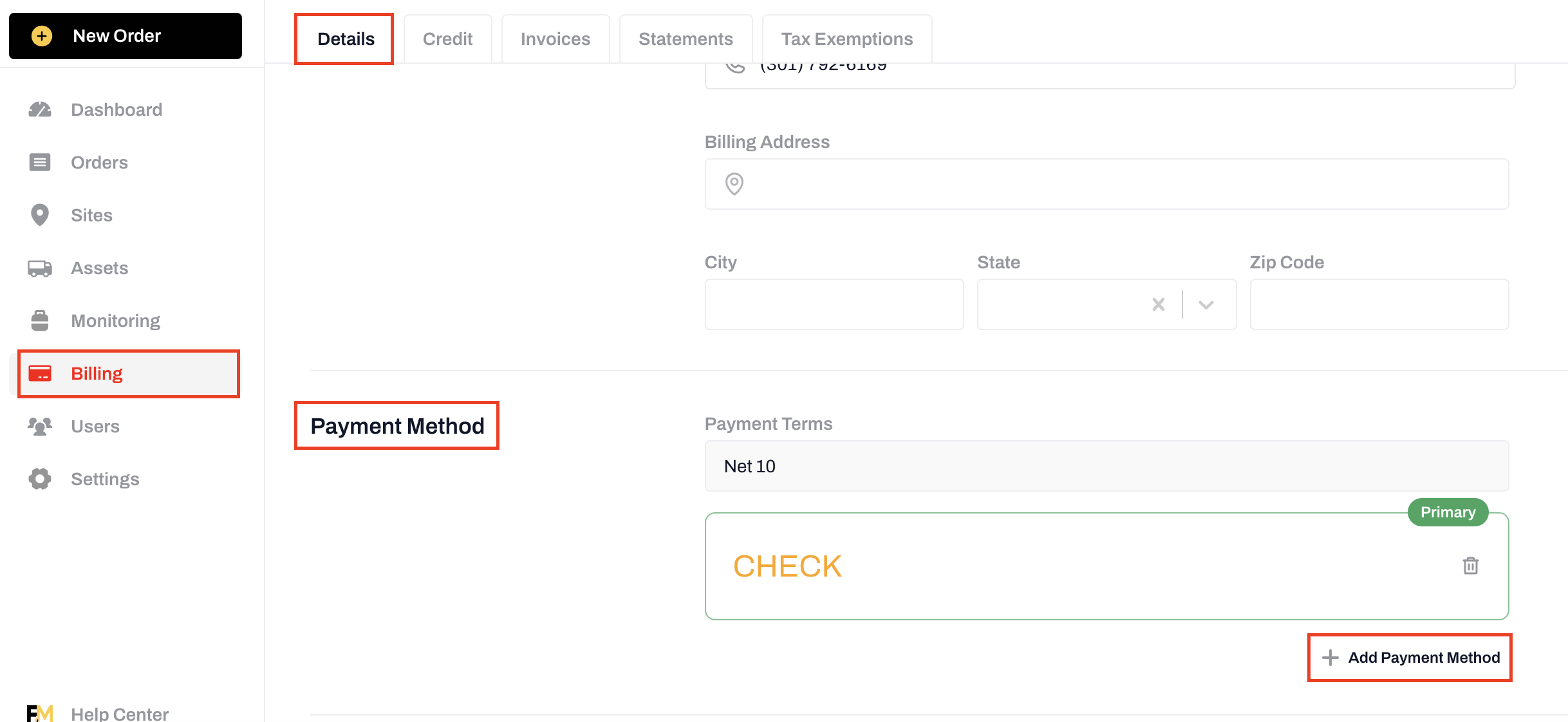 To update your payment method, go to 'Billing' from the main side bar menu, then click on the 'Details' tab and scroll down to Payment Method. Click on the '+ Add Payment Method' and choose how you would like to pay.