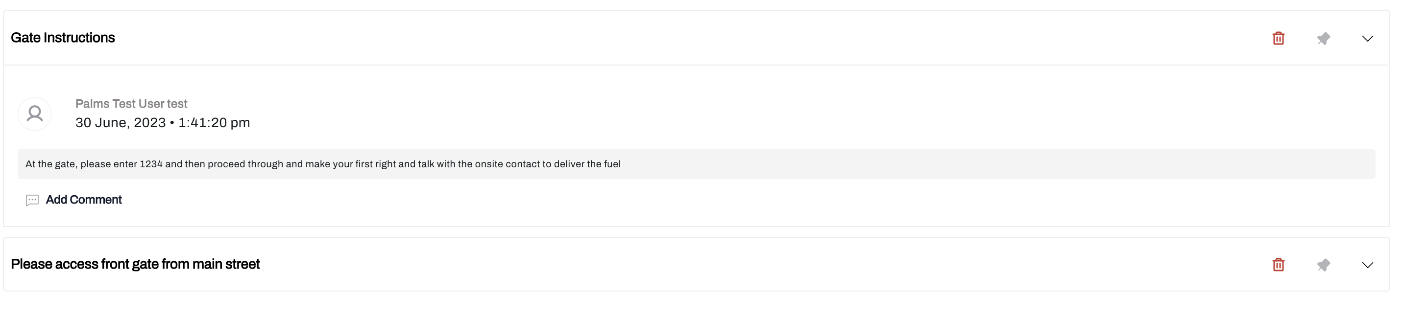 The Site Notes tab provides a dedicated space to add and view notes specific to each site. Here, you can document Site requirements, preferences or instructions for fuel deliveries or share details that may not fit into the existing fields for the Site record. You can also use the Notes feature as an internal communication tool by allowing Administrators to log internal Notes or Comments regarding fuel Orders.