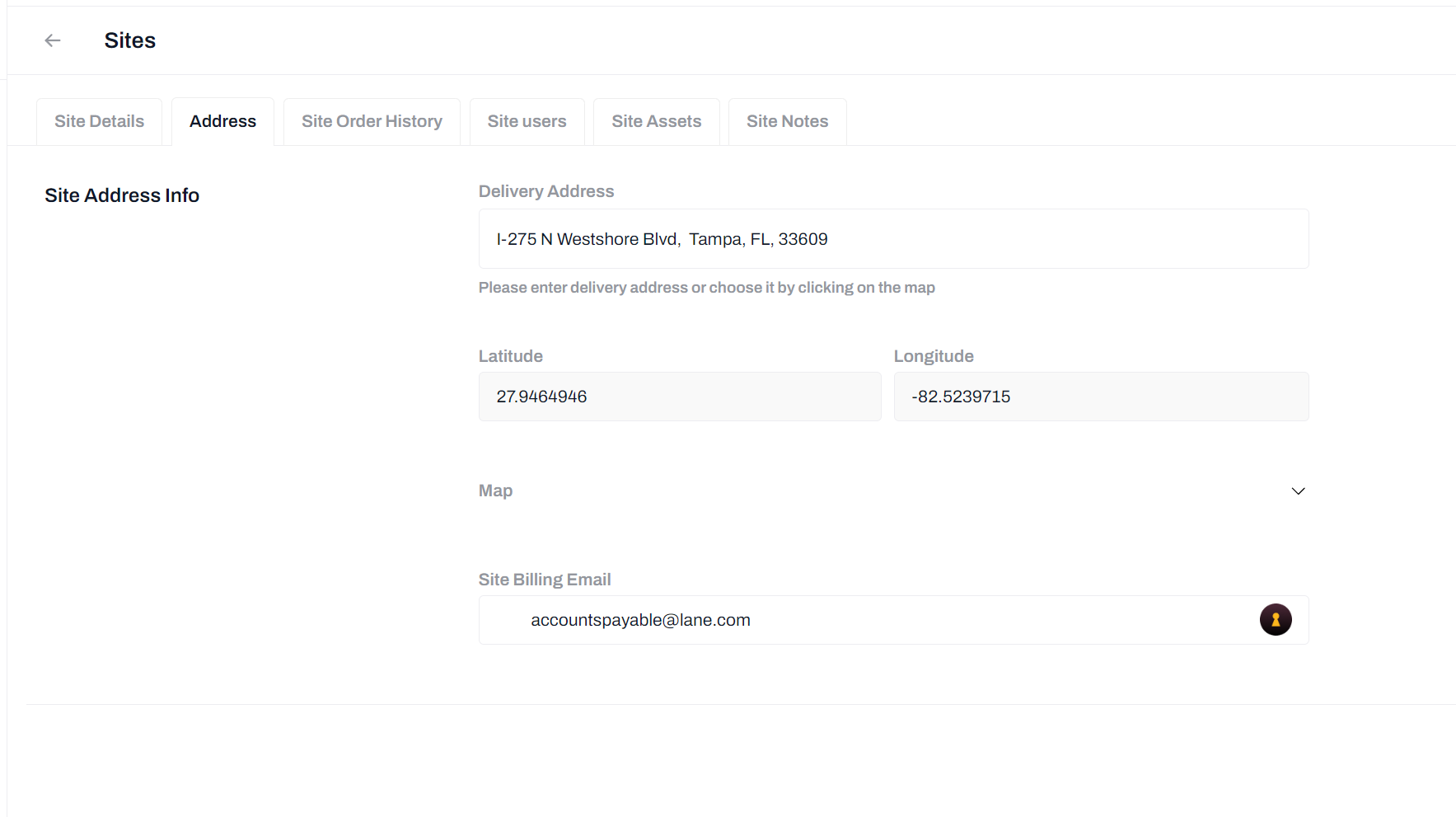 The Address tab within the Sites section allows you to view and manage the Delivery Address a for a specific Site. Here, you can also provide a Site Billing email if the Fuel Orders need to be billed differently for that particular Site.
