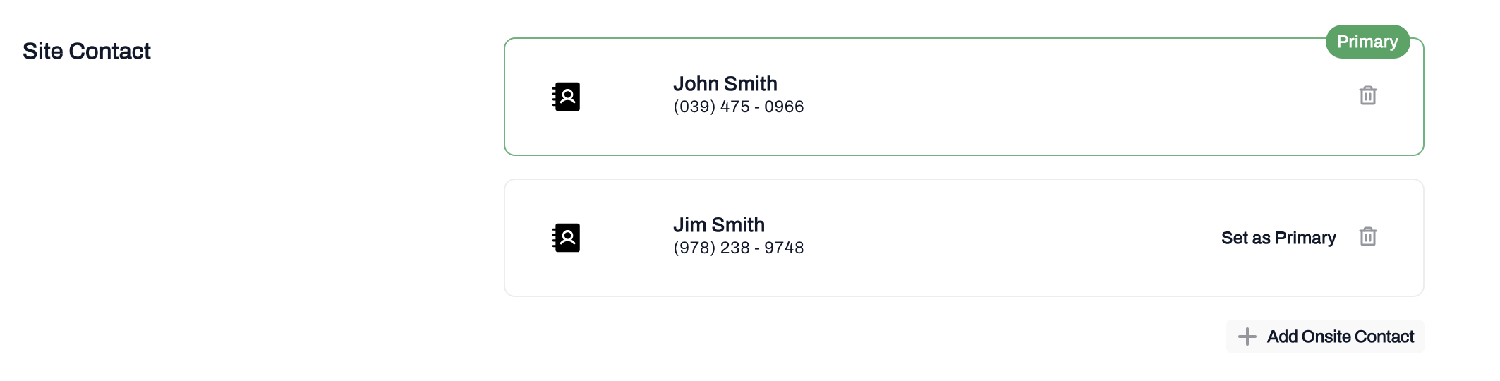 The primary site contact will be displayed in a green box. To change the primary site contact for a site, simply select the Set as Primary button in the desired contact box.