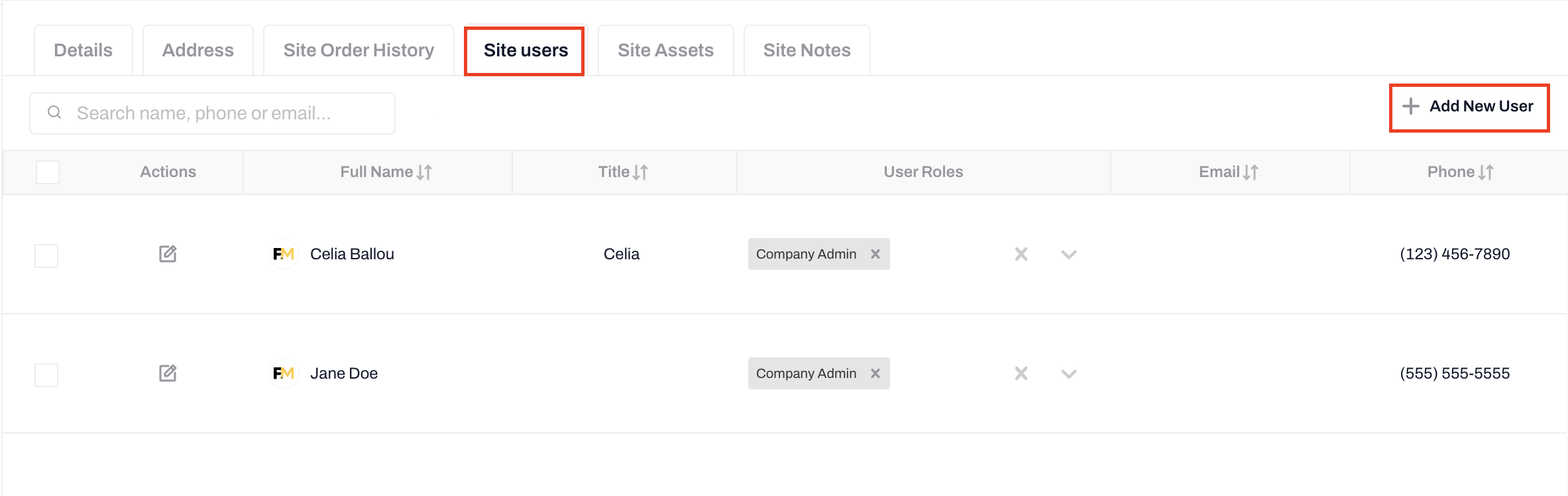 The Site User tab will only display for Account Owners and Company Admins. This tab allows them to view User details, such as their Role and contact information, for each Site and ensures that the right personnel have the appropriate permissions and access to Site information.